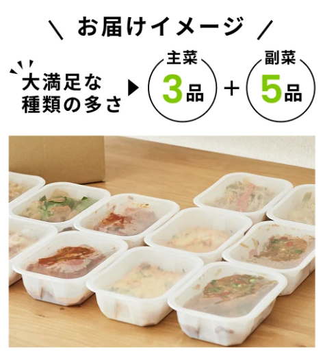 | お届け パック数 | 3食プラン 主菜:3~4、副菜:5~6 5食プラン 主菜:5~6、副菜:7~9 |